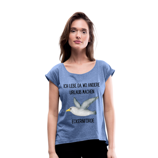 • Frauen T-Shirt mit gerollten Ärmeln - Wo andere Urlaub machen - Denim meliert
