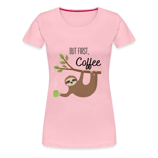 Frauen Premium T-Shirt - But first Coffee mit Faultier